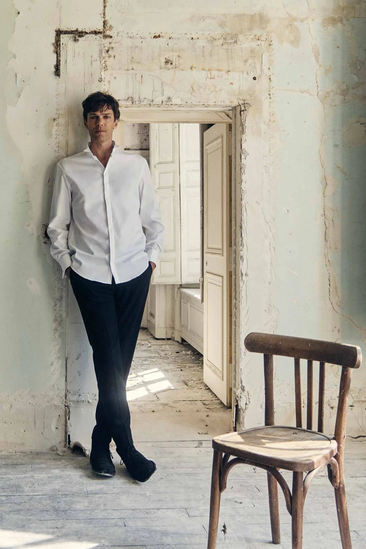 Homme brun portant une chemise col châle en lin blanc signée Bourrienne Paris X, modèle Transat, pose dans l'Hotêl de Bourrienne, adossé contre le mur.Homme brun portant une chemise col châle en lin blanc signée Bourrienne Paris X, posant dans l'Hotêl de Bourrienne, les mais dans les poches de son pantalon.