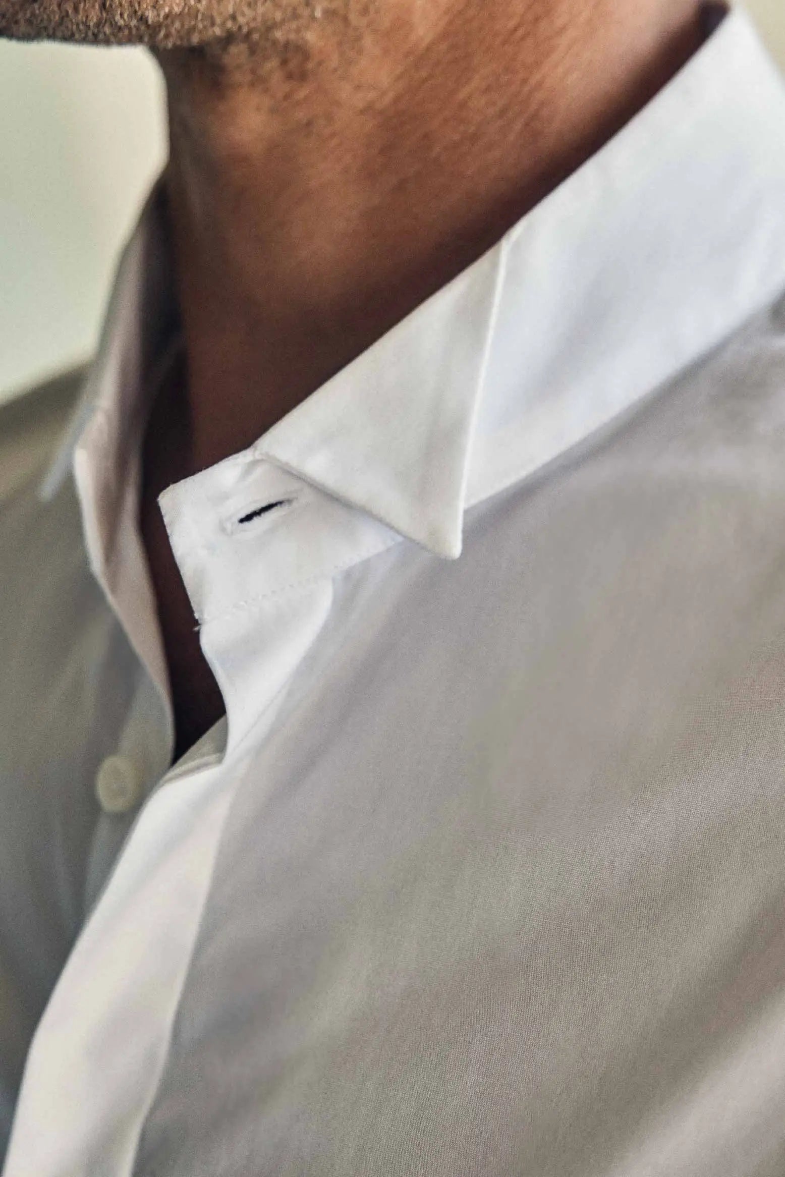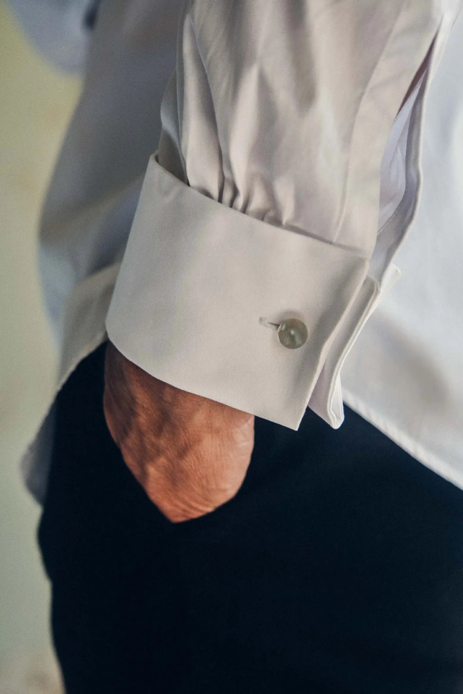 Designed for formal occasions, the SOIR shirt combines refinement and understated elegance. With its wingtip collar, French cuffs and concealed button placket, it is the perfect ceremonial piece. The double cufflinks, made of matte Australian mother-of-pearl, add a final touch of sophistication.