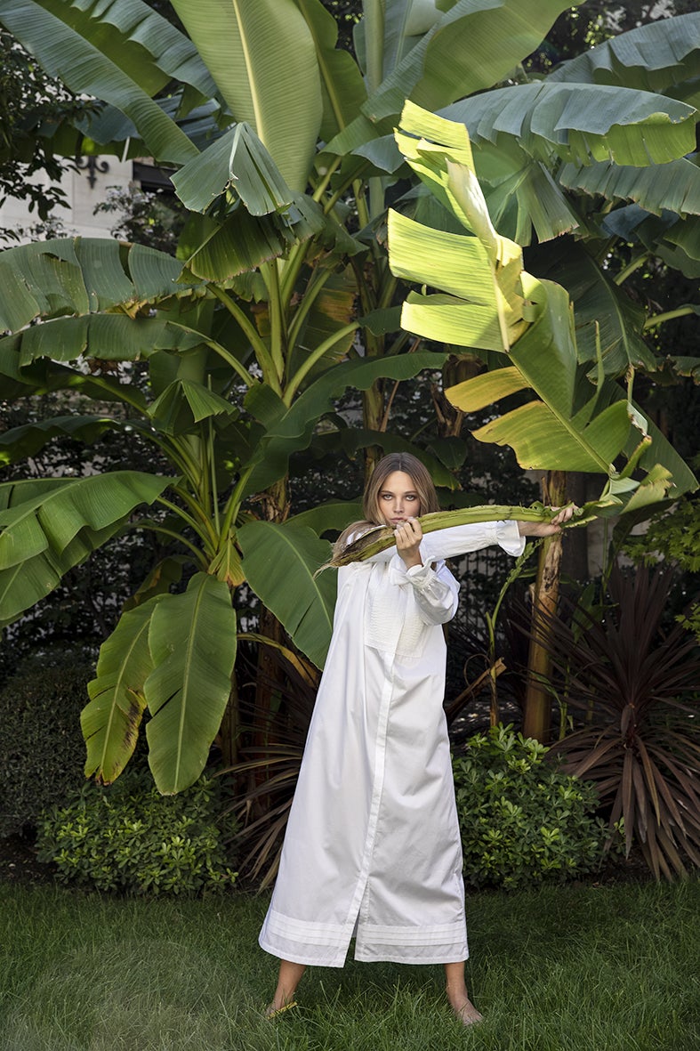 Notre première robe, tout droit sortie du XVIIIème siècle, arbore les galons inspirés des frises de l’Hôtel de Bourrienne. Nos galons et nos plastrons plissés sont un hommage aux artisans français. Les plis religieuses viennent signer cette robe de manière singulière.